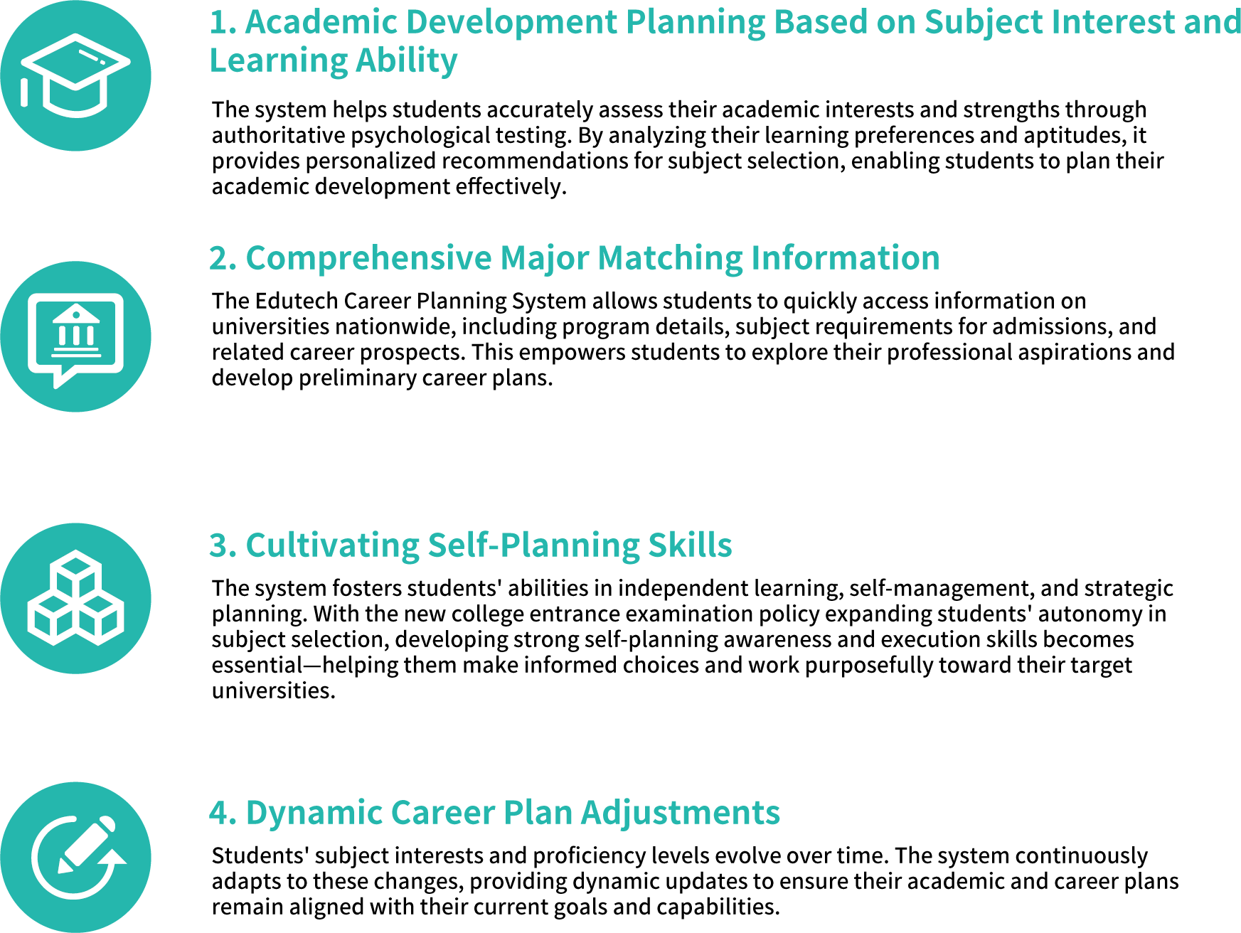 The Career Planning System integrates four key modules: subject interest assessment, academic aptitude evaluation, discipline matching analysis, and university information databases. By analyzing students' subject capabilities, interests, and optimal academic pathways, the system provides scientific guidance to help them make well-informed decisions about subject selection, university majors, and future career directions.