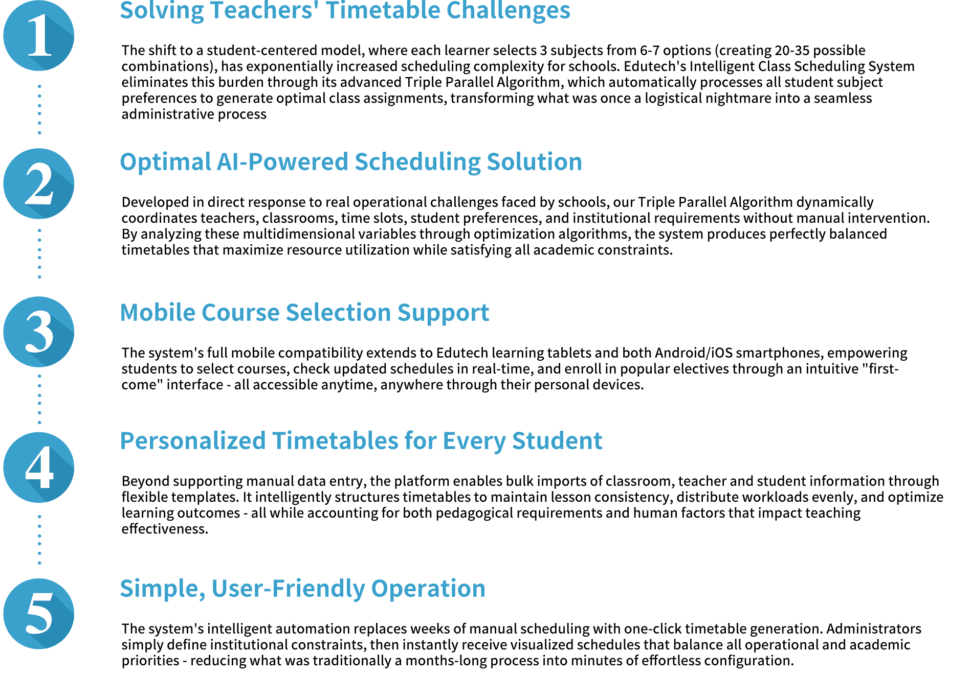 The Edutech Intelligent Class Scheduling System comprises four integrated modules: Basic Data Management, Elective Course Administration, Intelligent Class Allocation, and Comprehensive Timetable Management. This streamlined architecture provides end-toend support for all aspects of modern flexible scheduling requirements.
