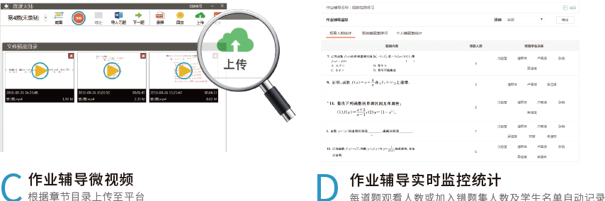 HappyClass Homework Guide System solves each student's problem through "one-on-one" style tutoring. If confused by a homework exercise, the student can watch a micro video recorded by the teacher through a phone,Pad or computer to hear the thorough explanation. The teacher can target specific questions when explaining the homework according to the statistics automatically generated by the system. Through keeping track of the number of viewers for each video explanation and the number of questions added to the commonly mistaken problem sets, the teacher can improve the effectiveness of teaching.