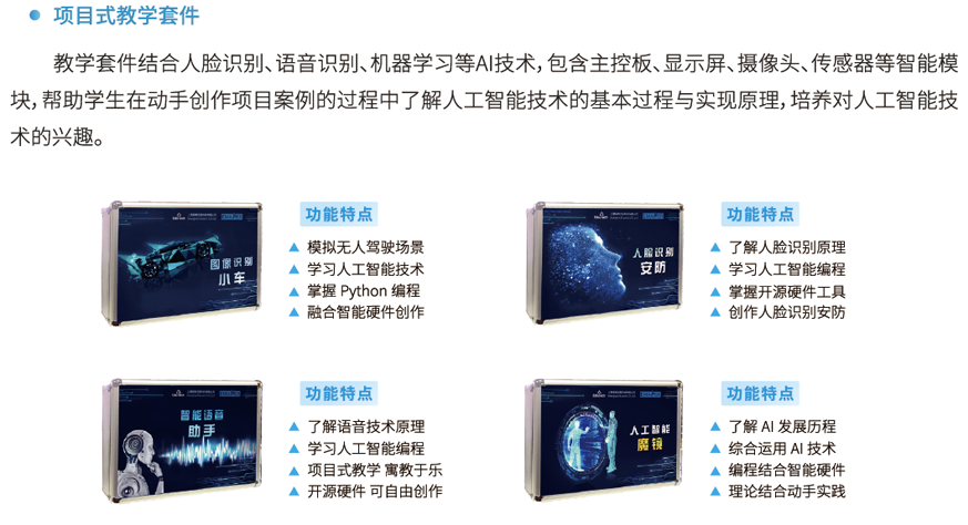中学普惠创新教育解决方案以人工智能为特色主题,通过丰富的项目式课程,结合易教自主研发的套件产品,帮助学生理解人工智能的概念与特征,搭建人工智能应用案例,亲历设计与实现人工智能系统的基本过程与方法,培养对前沿智能科技的兴趣,提升智能时代必备的科技素养与计算思维。
