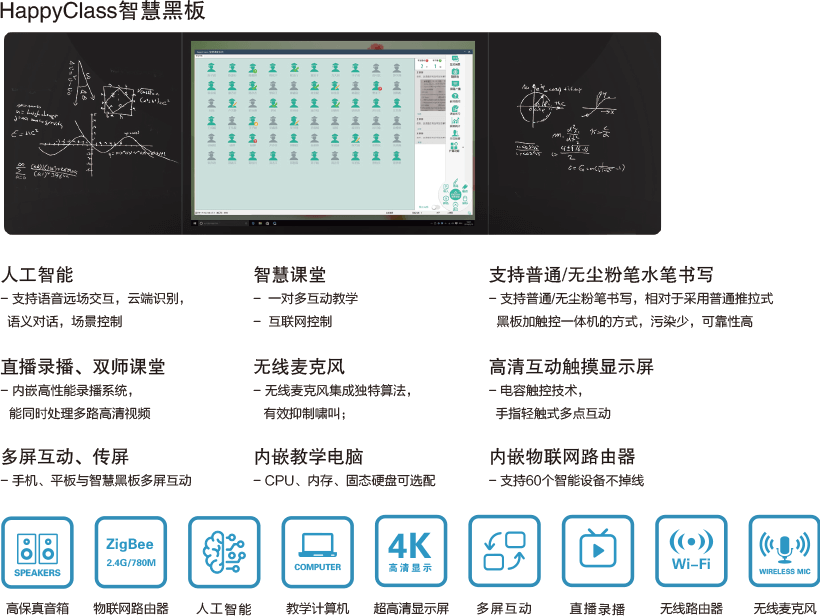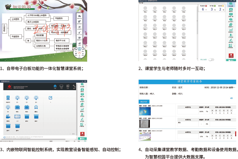 智慧课堂系统由智慧黑板、智慧课堂软件、智慧课堂教师Pad、学生PAD、手机、物联网路由器等组成。