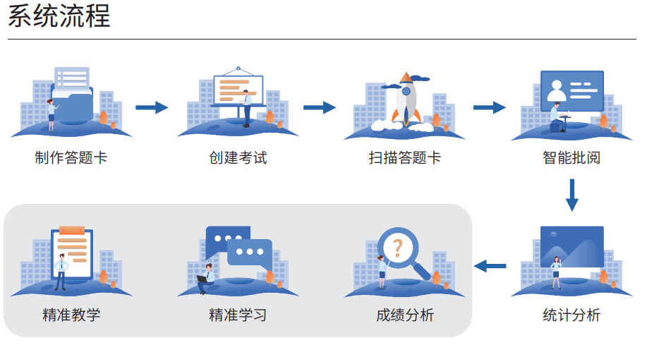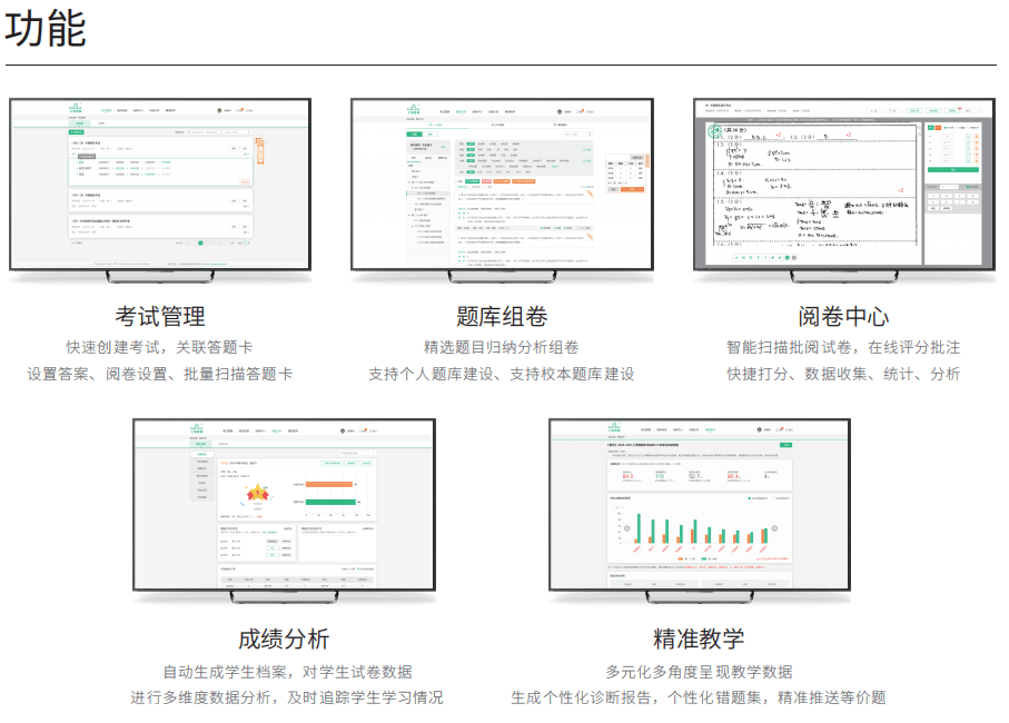 智能阅卷系统由智能阅卷平台、扫描客户端、移动阅卷app、精准学习(学生端)组成;是一 套服务于基础教育阶段,对学校日常作业和考试数据进行识别、采集、分析的教育智能系统。支持 对学生试卷数据进行多维度数据分析,自动生成各类统计分析报表。可以准确了解不同学生对各知 识点、知识模块、学科的掌握情况,对症下药提高临界生的转化率。