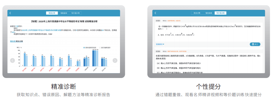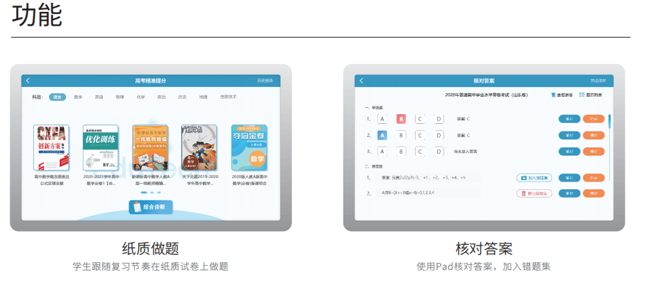 高考提分系统,基于高三每轮复习的教辅、试卷分析,精准定位学生的薄弱项,为每位学生定 制个性化的高考提分方案。学生可以随时随地自主收录错题,自动生成个性化错题本和精准诊断报 告。快速定位知识点、解决方法薄弱项,推送高考模拟题、历年真题、等价题、名师精讲等,从而 实现精准提分。
