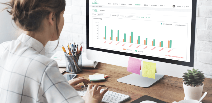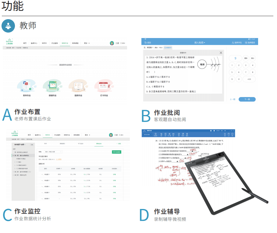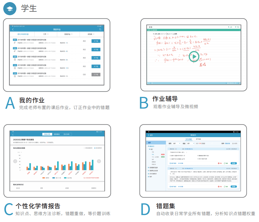 教师可以布置上传作业、教辅作业、题库作业、打卡作业等多种类型,在多终端上批改,系统 自动统计,生成多维度学情报告,方便老师快速定位问题学生、疑难知识点、高频错题,再针对性 的录制讲解视频推送给学生。学生可以通过学习机反复观看,解决学生作业“一对一”个性化辅导 问题