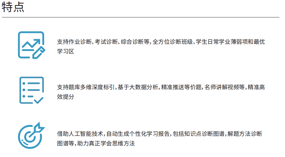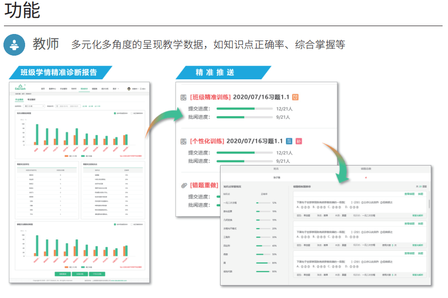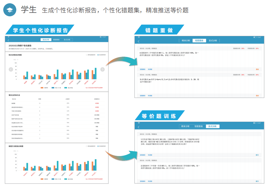 精准教学系统针对日常作业,周考,月考等数据,通过大数据智能分析,自动生成“班级学情 诊断报告”,“学生个性化诊断报告”,报告包括知识点精准诊断、解题方法精准诊断、错题重 做、等价题训练等,帮助师生快速定位薄弱项,从而实现精准学习。