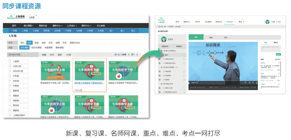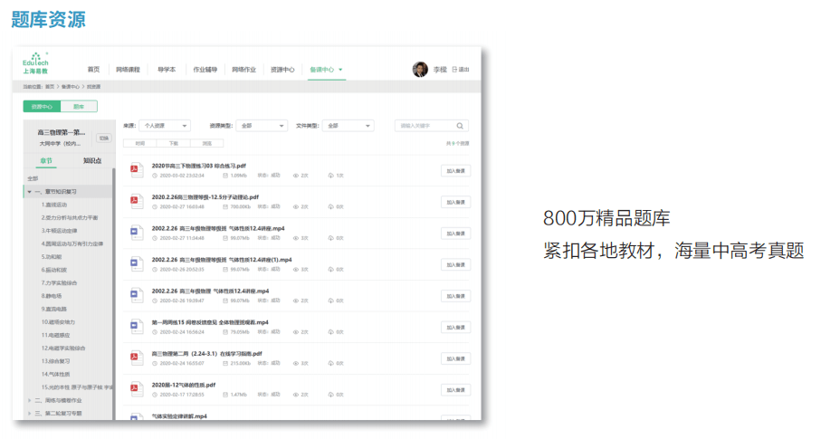 教学资源平台涵盖基础教育12个年级主要学科,汇聚精品资源、名校资源。资源具有覆盖面 广、针对性强、专业度高等特点。资源平台配备易教开发的专业资源库,与本地已有资源库进行有 效整合,建设适合本地特色的各类课程、模拟试题精讲类课程、学生综合素养类等课程,将优质教 育资源分享给有需求的学生。