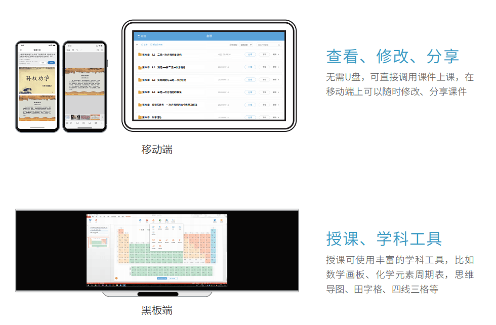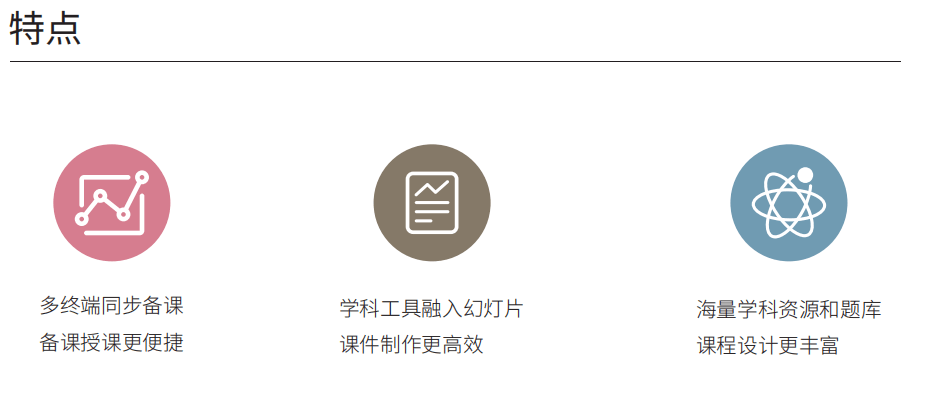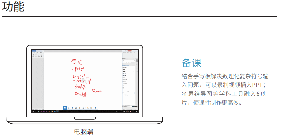 备授课系统为教师提供三端一体的备课、授课服务,包括电脑端、移动端、教室大屏端。教师 可以方便的在电脑上制作课件、教案、测验等多种样式的备课资源,实时同步至云端,在教室大屏 端轻松使用课件授课,在移动端随时随地查看、修改、分享课件。同时也提供了找资源、找题、备 课工具等,让备授课更高效、更灵活。
