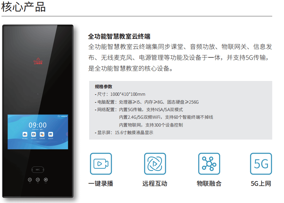 智慧课堂系统基于物联网技术,以智慧黑板为中心,无缝连接移动学习终端、录播、PC、手机等设备, 实现了老师与学生双向实时“一对多”互动教学,同时也能实现课堂教学数据自动采集,教室环境智能感知, 教室高密度 Wi-Fi 覆盖,智能录播、课堂评价、移动授课等功能,切实提高教学质量和教学效率。