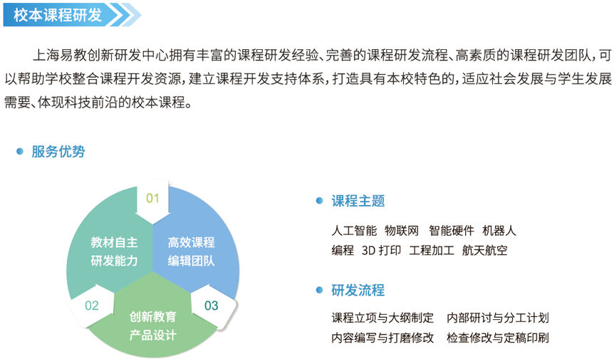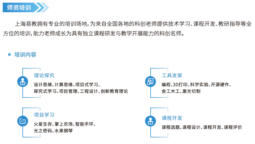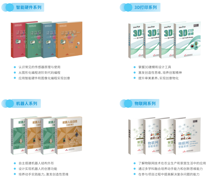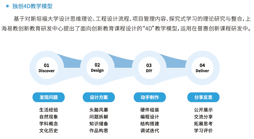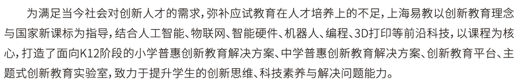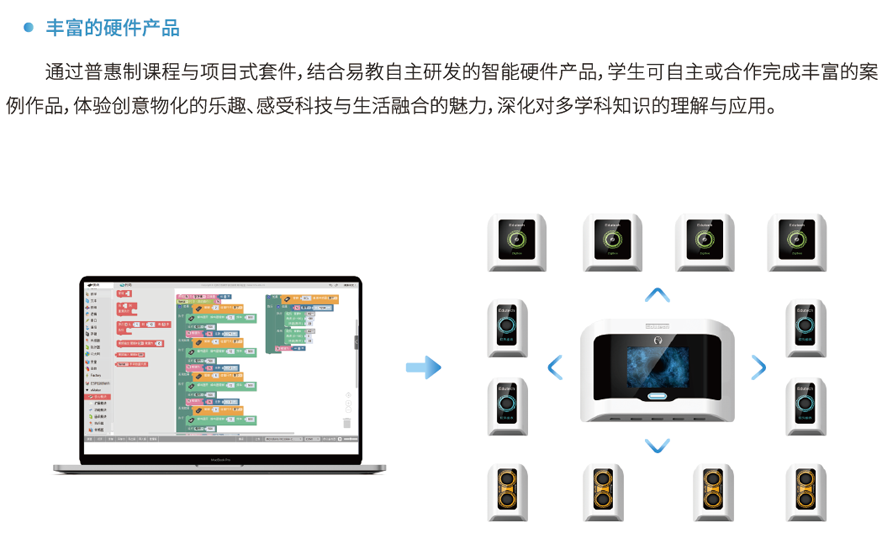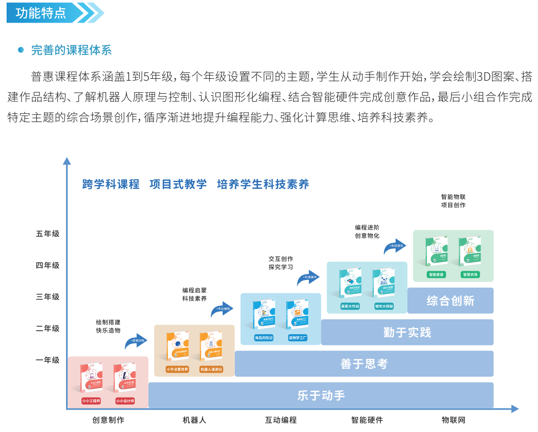 为推动STEAM创客教育在中国的均衡发展,让所有学生都能享受优质的创客教育,上海易教科技股份有限公司推出"STEAM创客普惠"系列课程。该系列课程是基于STEAM课程理念、项目式教学方法、核心素养等理论 ,结合前沿的物联网、机器人、智能硬件等技术,打造的面向小学1-5年级的整体课程体系。