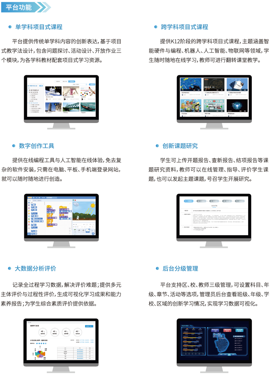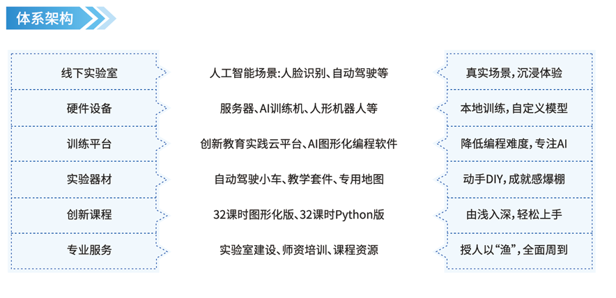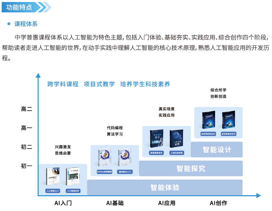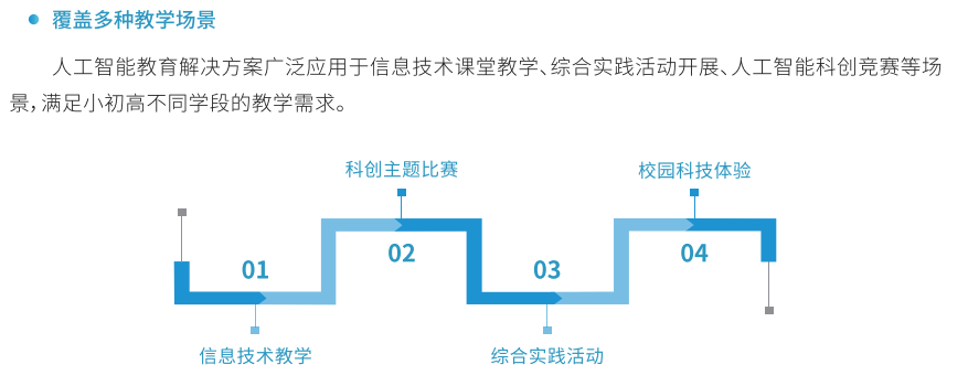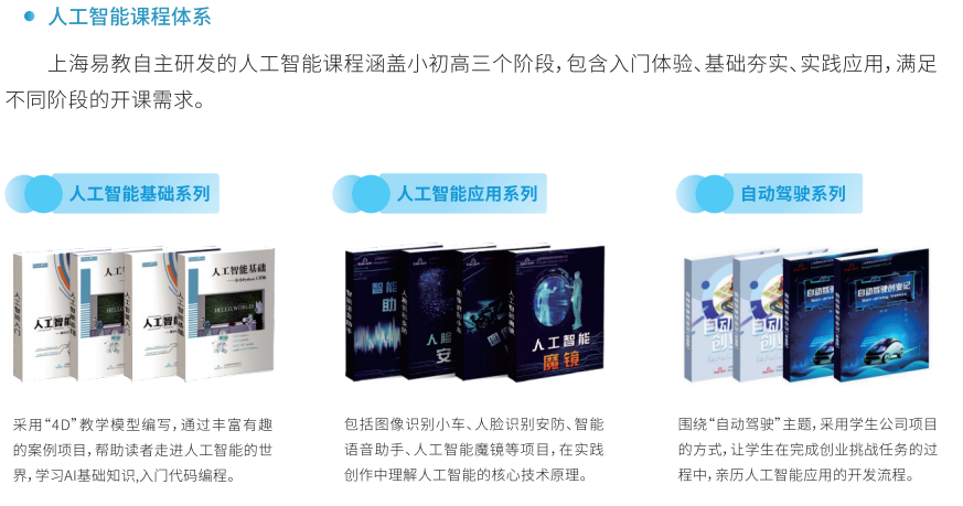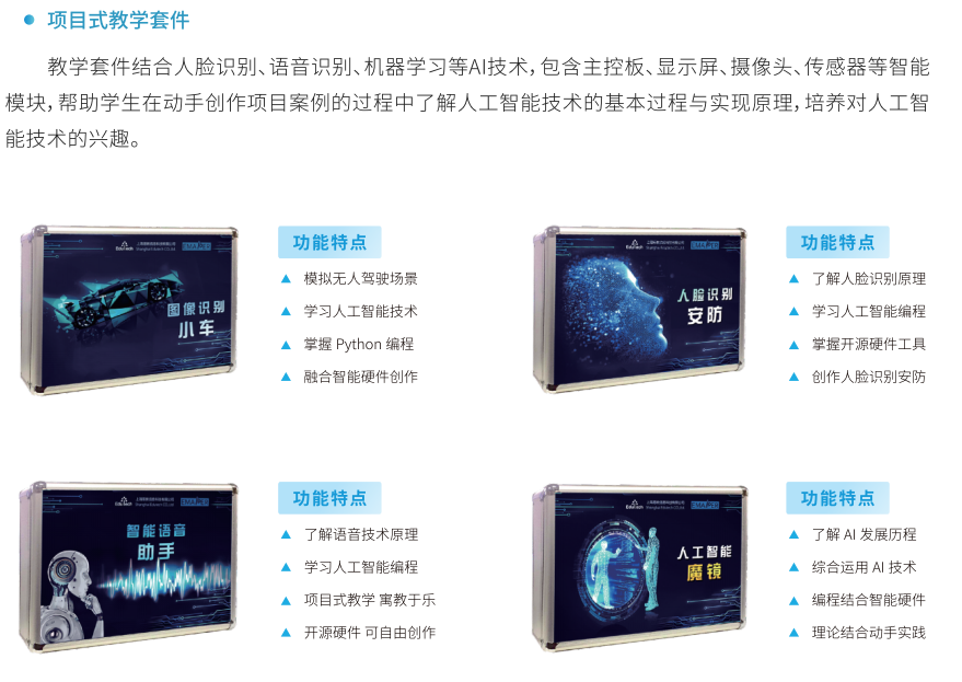 上海易教人工智能教育解决方案为学生提供人工智能前沿科技的体验与学习,包含从入门到进阶,再到应用与竞赛的完整学习阶段,帮助学生理解人工智能的概念与特征,搭建人工智能应用案例,亲历设计与实现人工智能系统的 基本过程与方法,学习人工智能基本原理与编程,培养对人工智能前沿科技的兴趣。