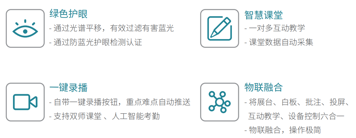 HappyClass绿色护眼智慧黑板采用光学防蓝光(光谱平移)技术,从光源处着手,将峰值450nm以下的有害短波蓝光转换为460nm无害长波蓝光,即不影响屏幕显示效果,又有效避免了蓝光对眼睛的伤害,已通过国家权威机构蓝光无危害检测。