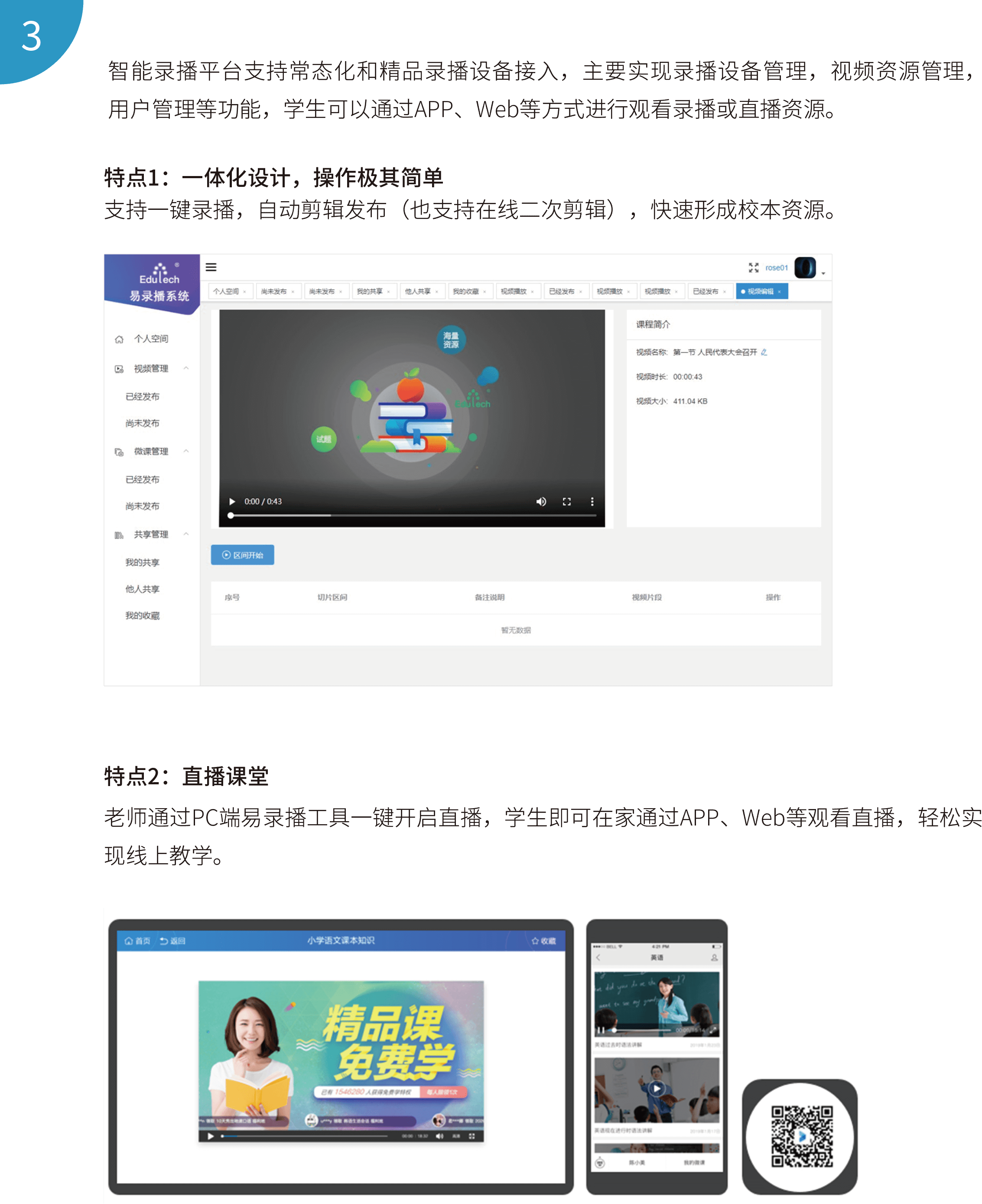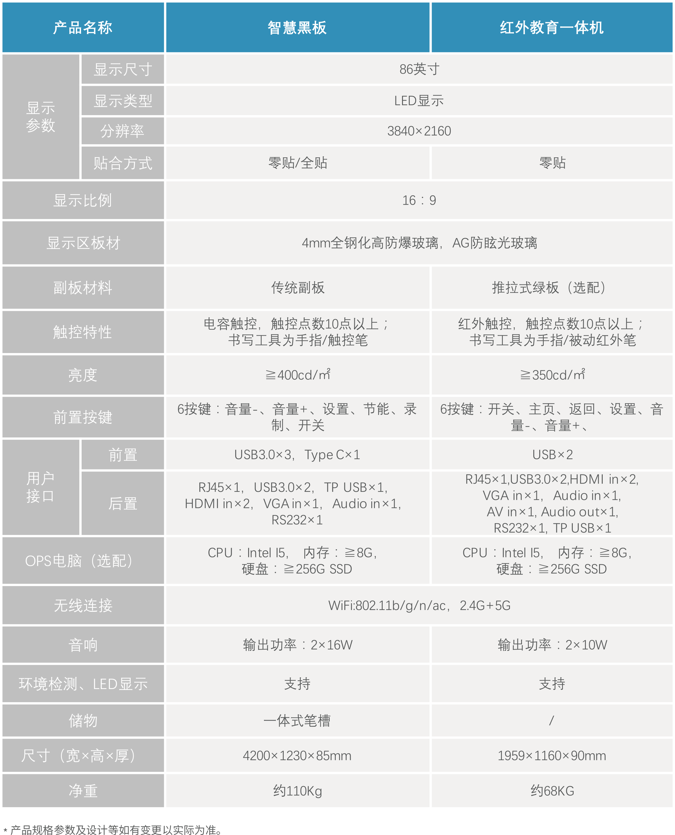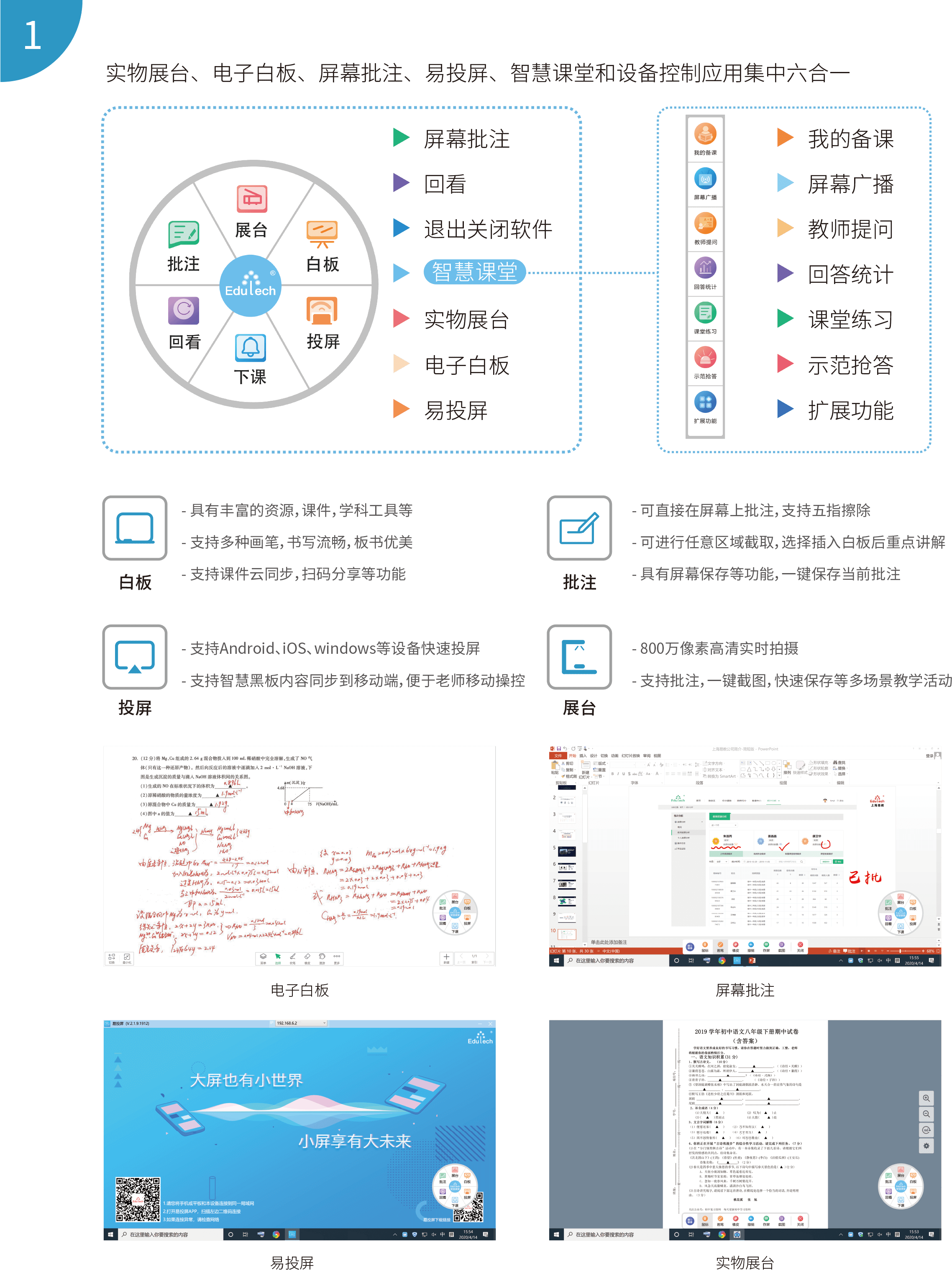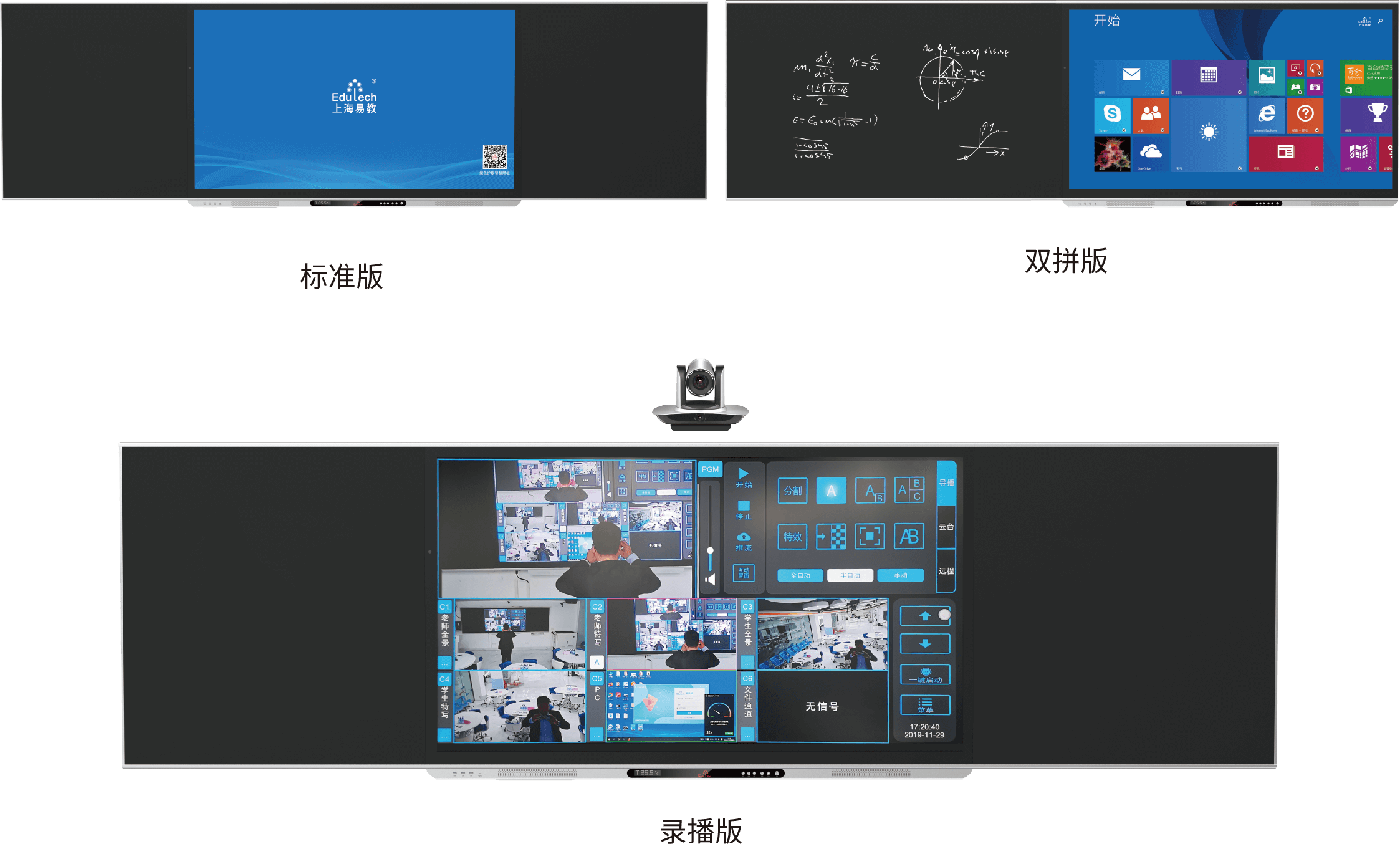 智慧黑板集传统黑板、大屏显示、屏体触摸控制、OPS电脑、音响、高拍仪、物联网等相关设备于一体;既能实现交互一体机的全部功能,又能用传统粉笔在整个板面进行书写;内嵌了智慧课堂、一键录播、人工智能系统,一根网线一根电源线即可实现未来教室全部功能,是未来教室的核心设备。